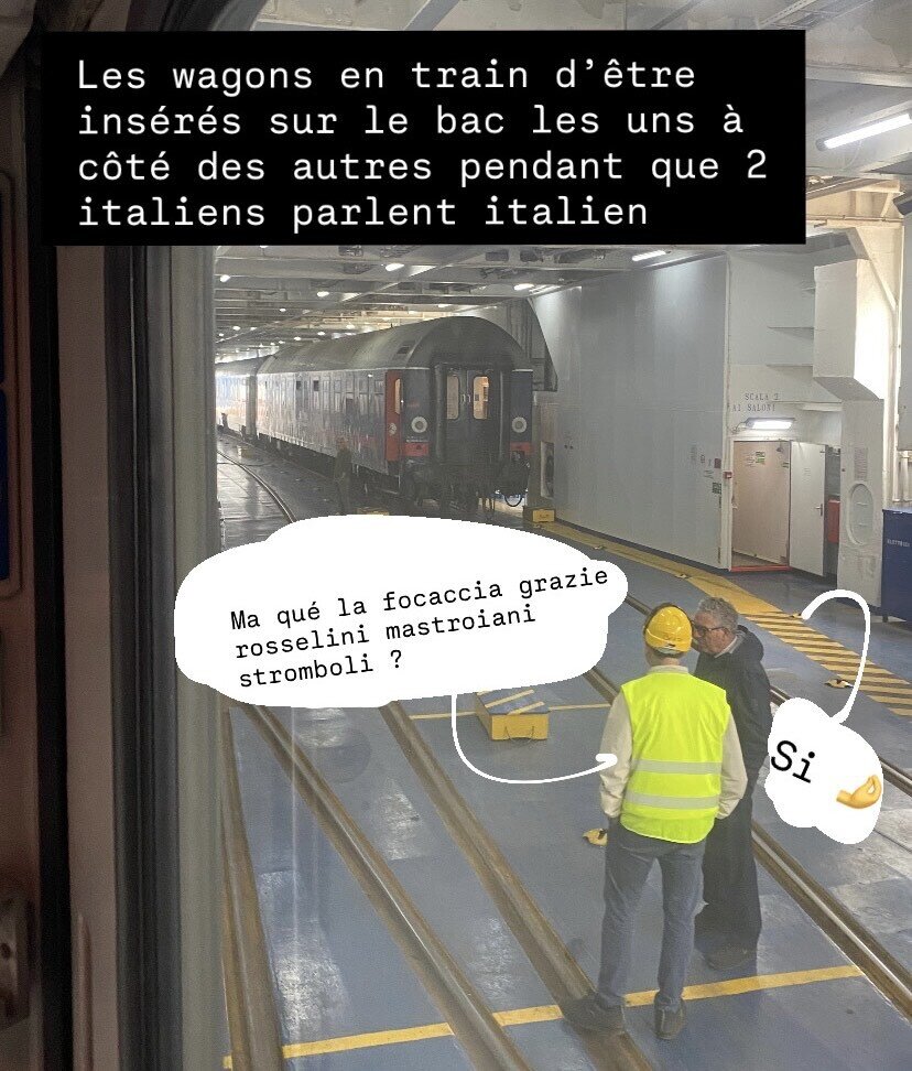 De 23h à 8h on dort du sommeil du juste. Le contrôleur fait un passage au petit matin pour nous filer un jus absolument dénué de goût, un biscuit sec et un ristretto qui m’a fait saigner du nez. Il faudra se satisfaire de cette collation de taulards pour tenir jusqu’au ferry. Eh oui car, à 10h30, arrivée à la pointe de la Calabre (Villa San Giovanni) au bout de laquelle la fascinante manœuvre débute : le train est inséré wagon par wagon sur une plateforme flottante (appelée traversier-rail en bon québécois). Les quatre wagons se retrouvent les uns à côté des autres et la mini croisière met les voiles. On peut alors sortir se dégourdir les pattes et prendre l’air sur le pont en ingérant une focaccia moyenne. 3 km nous séparent du port de Messine, 30 minutes pour traverser le détroit et remettre les wagons dans le bon ordre des choses une fois revenus sur la terre ferme. On déboule à Catane à 14h avec au compteur : 1279 km et 11,5 kg de CO2.
