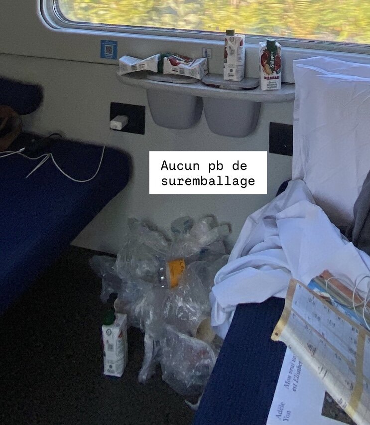 Les couchettes sont d’abord relevées de manière à former deux banquettes qui se font face. Idéal pour se regarder dans le blanc des yeux avec nos voisins taiseux avant que l’un de nous ose engager le move couchettes. Conseil avisé : préférez toujours la couchette du haut. Il y a plus d’espace pour ranger son bordel et on se sent moins menacé par les pieds du voisin. Pas de douche, ni de repas prévu. Selon votre tolérance au manque d’hygiène vous pourrez quand même laver vos chicots dans un lavabo crade et gagner le respect de vos colocataires. C’est pas le grand luxe mais la compagnie ferroviaire offre tout de même un kit de literie : masque pour les yeux, drap, couette, oreiller et lingette hydroalcoolique qu’il ne faut PAS utiliser pour se laver le visage (seule une personne demeurée ferait ça… bref, je vous le dis, ça pique la peau). Le tout suremballé de plastique ce qui fout en l’air la naïveté de mon voyage 100% éthique mais en même temps, entre un oreiller suremballé et un oreiller douteux, j’avoue opter pour un maximum d’emballages polluants (on a tous nos failles, surtout Gaël).