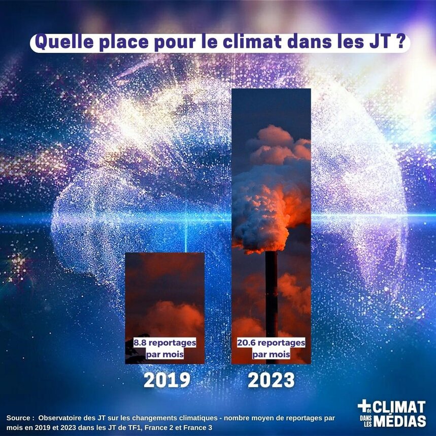 Et si le climat s'emballe, pas de quoi le limiter avec ces maigres chiffres. 2 ans plus tard, en pleine période de campagne des élections législatives en 2024, le sujet du réchauffement climatique a été quasi évacué du débat public. Si l'on regarde l'ensemble des enjeux environnementaux (biodiversité, ressources naturelles), ce n'est pas mieux : sur les 900 minutes de journaux télévisés consacrés aux élections législatives, seules 6 minutes ont été consacrées à l'explication des volets écologiques des programmes (JT de midi et soir de TF1, France 2 et M6, données Climat Médias). Finalement les médias commentent les conséquences météorologiques du climat quand elles se manifestent plus qu'ils n'informent (exemple parmi d’autres : la période de vagues de chaleur, désormais présente chaque été).