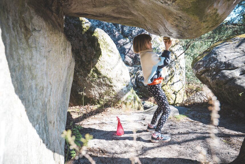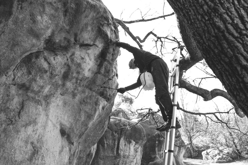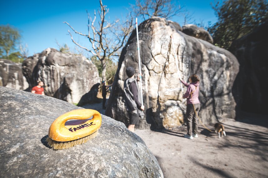 Pour Pierre Delas, président de du média associatif Fanatic Climbing et bleausard depuis presque 20 ans : « Le nouveau public est moins attentif aux codes de bonne conduite en milieu naturel. [...] Beaucoup de salles privées font la location de crash pad. Pourquoi ne font-ils pas de travail de sensibilisation en même temps que la vente ou le prêt ? » Créée en 2021, l’association Fanatic Climbing organise deux fois par an des sessions de nettoyage de la forêt en collaboration avec l’ONF et le Smictom régional. Réunissant une soixantaine de personnes au printemps et à l’automne, ces journées de clean up permettent à la communauté de se rassembler autour d’une action très concrète : nettoyer les blocs à l’eau et au vinaigre, ramasser les déchets et faire de la sensibilisation en diffusant les bonnes pratiques auprès des usagers de la forêt. La dernière en date s’est tenue le 28 septembre dans quatres secteurs de grimpe différents, une session ensoleillée où plus d’une centaine de blocs ont retrouvé leur peau de rocher.