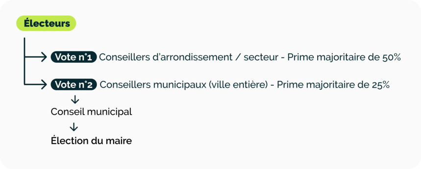 Résultat ? Le conseil municipal est élu directement par tous les électeurs, les arrondissements restent importants, mais ne décident plus à eux seuls de la mairie. Capito ?